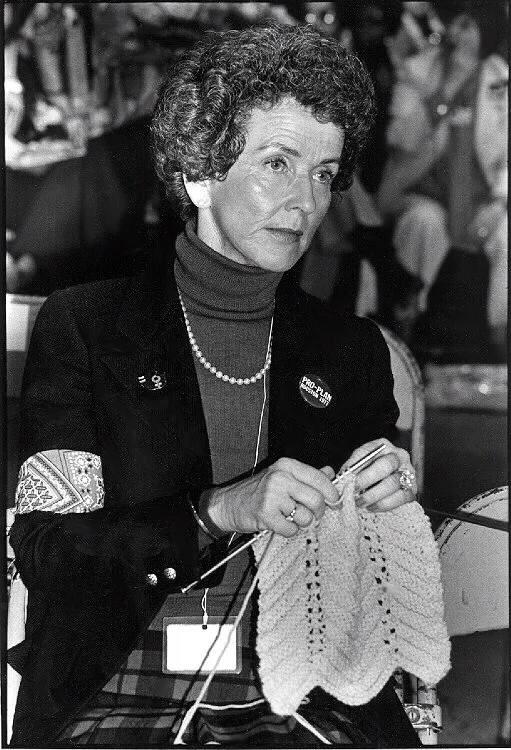 Mary Crisp, Republican Party Co-Chair, Pro-Plan button and pearls, knitting